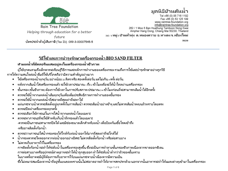 Learn about how to install, use and maintain a biosand filter. Created in Thai by Rain Tree Foundation