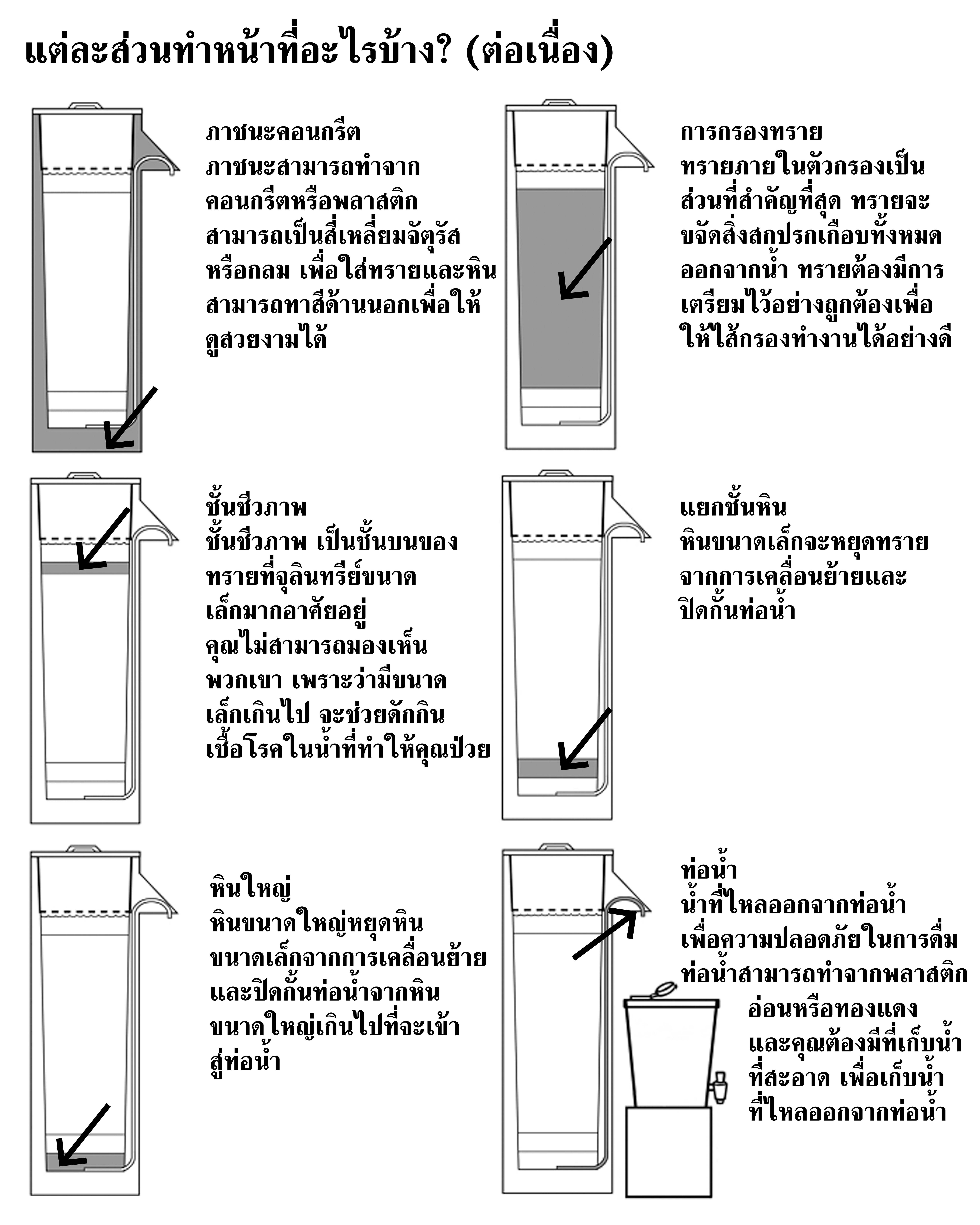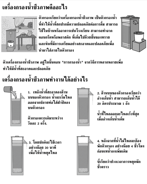 This poster depicts the components of the biosand filter. This poster was created in Thai by Rain Tree Foundation.