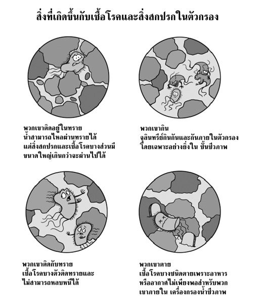 This poster depicts the various methods in which pathogens are removed from water inside the biosand filter. This poster was created in Thai by Rain Tree Foundation
