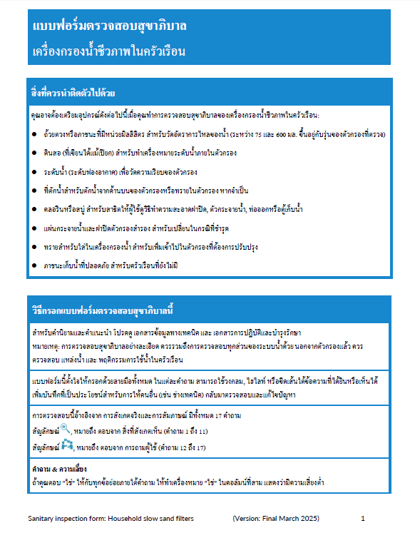 This sanitary inspection form is used to evaluate actual and potential sources of contamination for a biosand filter.
