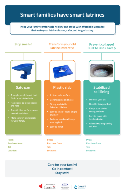 This poster, developed as part of the Global Affairs Canada (GAC) project, is designed to promote affordable latrine upgrades that improve hygiene, safety, and durability for families. It highlights three key solutions and encourages households to enhance comfort and prevent common sanitation issues.