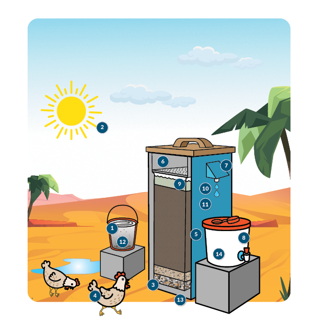 Este póster de un filtro de bioarena versión 9 puede utilizarse cómo actividad de rompecabezas en una capacitación o evento comunitario *Nota: Este recurso es para proyectos de implementación de la versión antigua de filtros, la versión 9.