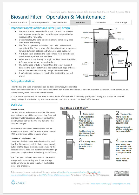 This operation & maintenance sheet outlines key information on the proper operation, maintenance, and care of household biosand filters. It explains daily use practices, required maintenance steps, and safe water handling procedures to ensure effective water treatment and long-term filter performance.