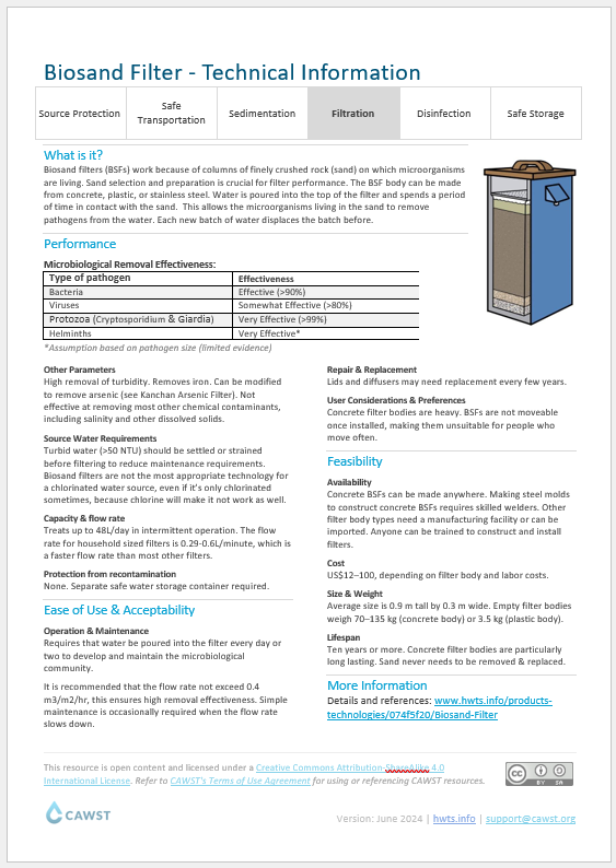 A thorough sanitary inspection consists of inspecting all parts of the water system. In addition to this sanitary inspection of the household technology, inspections of the water source and household practices should also be conducted. The World Health Organization (WHO) has developed sanitary inspection packages for a range of small water supply scenarios, visit their website to download the packages. Please note that the format of the WHO sanitary inspection forms differs from the CAWST ones.