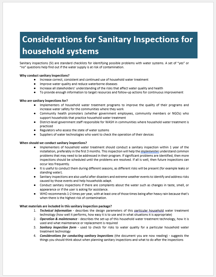 This collection contains sanitary inspection packages for different household water treatment technologies. Use these packages to evaluate actual and potential sources of contamination and recommend actions for continuous improvement.