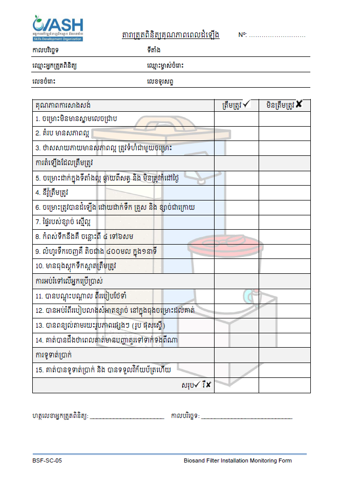 This simple checklist can be used by implementers installing biosand filters to ensure that the filter is in good condition and is installed correctly