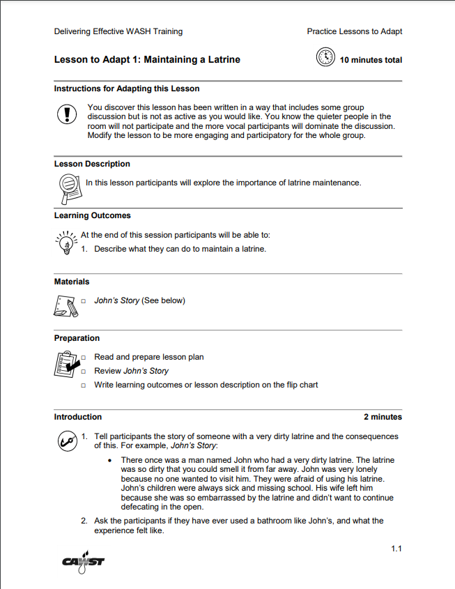 In this lesson participants will explore the importance of latrine maintenance. Modify the lesson to be more engaging and participatory for the whole group.