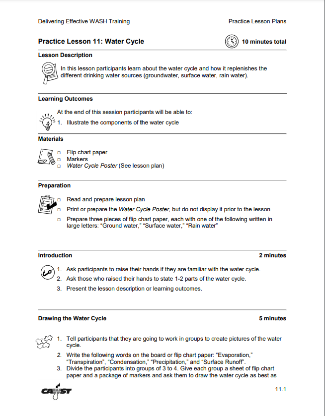 In this practice lesson participants learn about the water cycle and how it replenishes the different drinking water sources (groundwater, surface water, rain water).